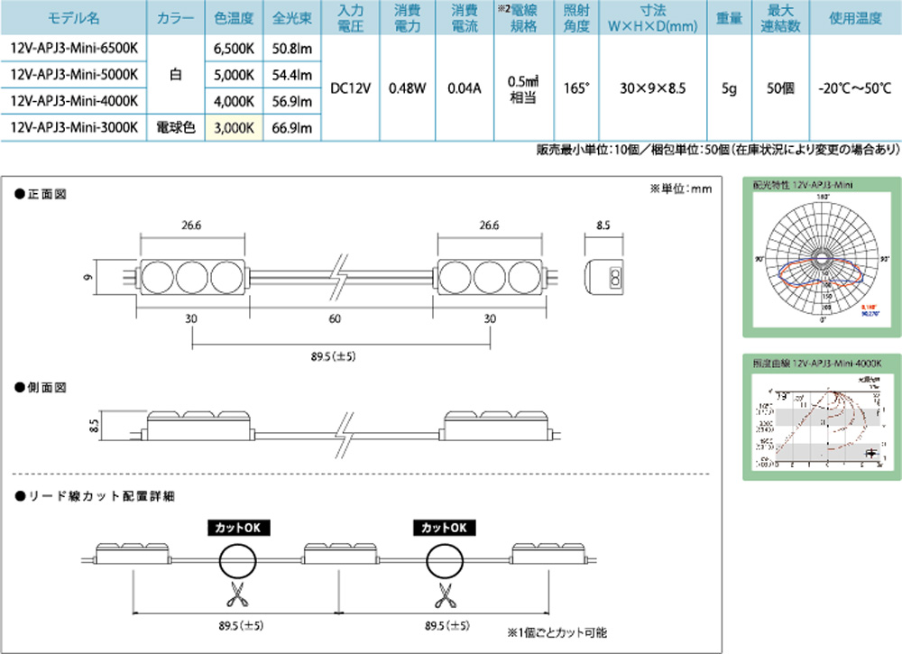 12V-APJ3-Mini 12ボルト-エーピージェイ3-ミニ ・信頼性とあらゆる環境で使用可能なDC12V・小型3球モジュール ・最大連結50個 ・1個単位で使用可能 ・看板厚40mm以上推奨 資料ダウンロード フライヤー 仕様書 取扱説明書 姿図(DWG) 詳細スペック